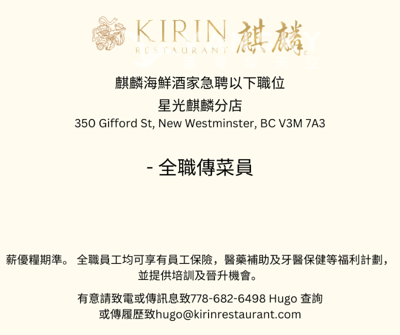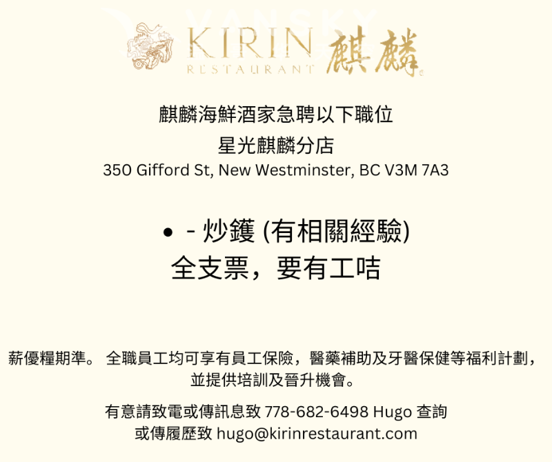 | 详情描述 New West food court 请帮厨,或兼少量收银工作(需基本英文)。请短信 778-389-2911. | |