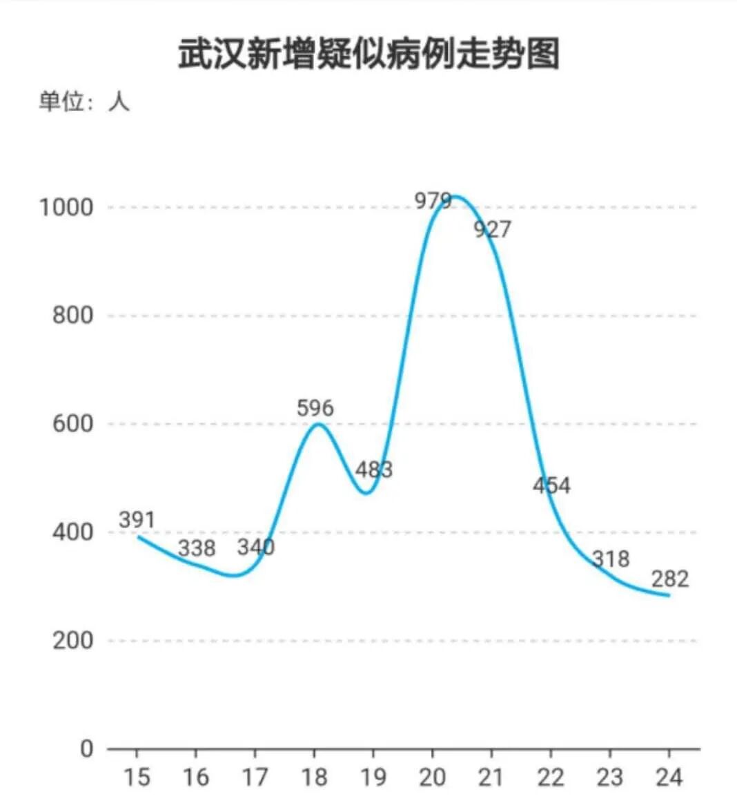 从武汉新增疑似病例看,2月15日为391例,然后不断增长,20日增加到979例,然后开始一路下降,昨天为282例。