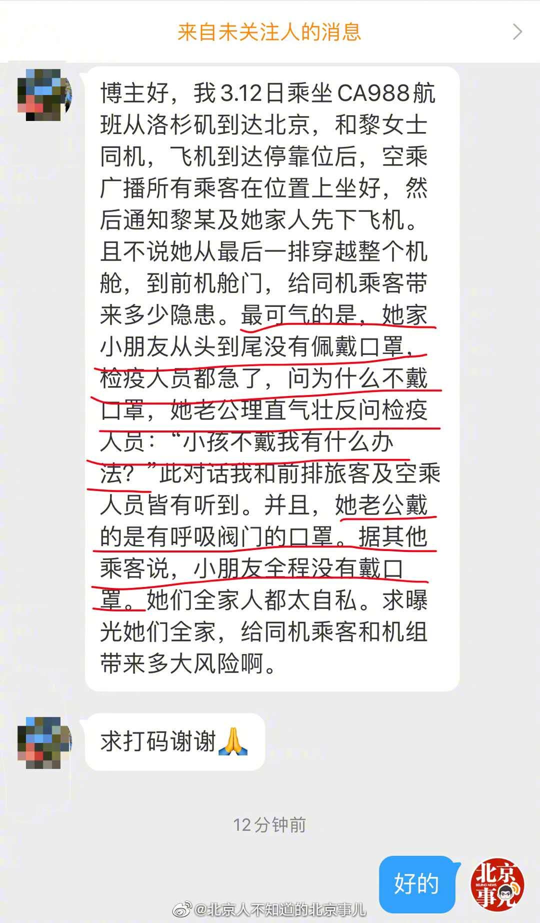 还有同航班的乘客,爆了更多黎某一家的料。黎某的儿子作为她的密切接触者,全程不戴口罩。。。