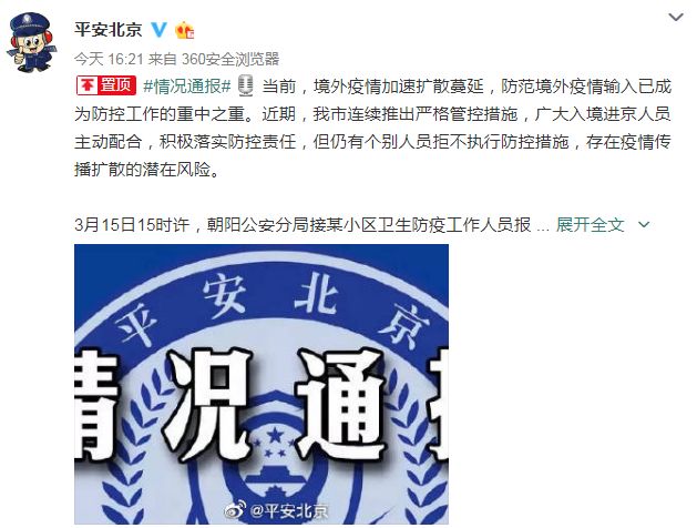 当前,境外疫情加速扩散蔓延,防范境外疫情输入已成为防控工作的重中之重。近期,北京市连续推出严格管控措施,广大入境进京人员主动配合,积极落实防控责任,但仍有个别人员拒不执行防控措施,存在疫情传播扩散的潜在风险。