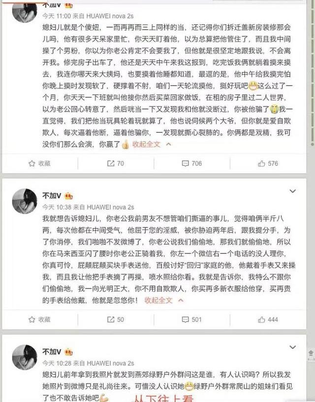 在此期间,她和几个争议颇大的女作家绵绵、卫慧、春树等一齐被人称为“身体写作派”女作家,不久她又以“不加V”的ID名开通了微博,通过不断跟方舟子、赵子琪等人撕逼保持热度,还在不经意间暴露出自己和著名出版人路金波、张歆艺前夫杨树鹏等人的一夜情,让人叹为观止之际不得不竖一竖大拇指: