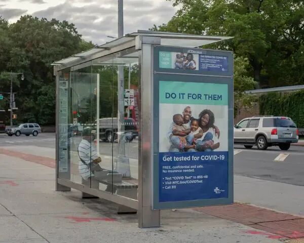 美国纽约布鲁克林一个公交车站的免费核酸检测广告 (图片来源:《纽约时报》)