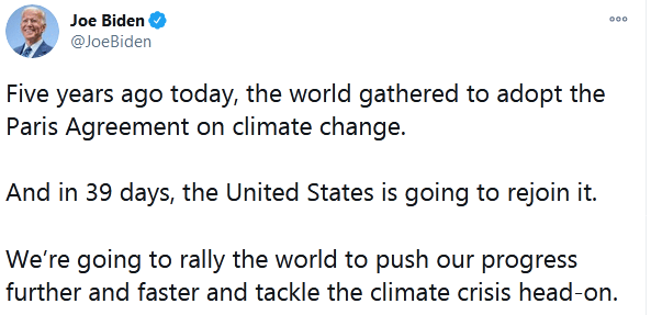 拜登:39天后美国将重新加入《巴黎协定》- [77] (2020-12-12 15:36:35) (0) (0)拜登:39天后美国将重新加入《巴黎协定》 【环球网报道】美国当选总统拜登北京时间13日在其社交媒体上宣布,美国将重回《巴黎协定》。 拜登写到:“五年前的今天,世界各国齐聚一堂,通过了关于气候变化的《巴黎协定》。 39天后,美国将重新加入。 我们将团结全世界,推动我们取得更大更快的进展,直面应对气候危机。