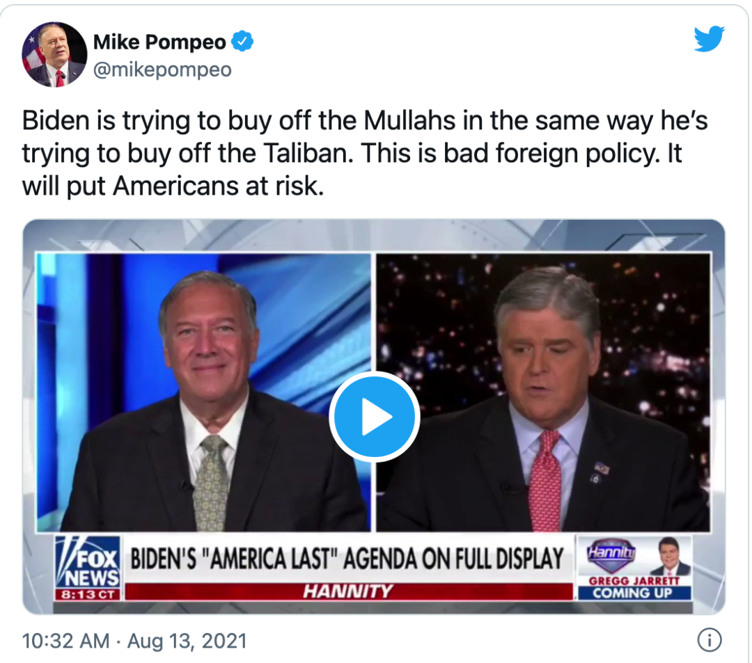 如今已经卸任的蓬佩奥最近依旧不断亮相媒体,指点江山:先是批评拜登在阿富汗的撤军是“一场灾难”,也同样对于拜登在伊朗问题上的“软弱”表达强烈不满。