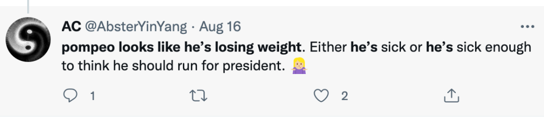 一位网友的评论如下:“蓬佩奥看起来体重掉了太多!要么是他生病了,要么就是他心理生病,认为自己可以竞选总统了。”