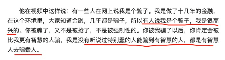 被翟山鹰诈骗的人一定是他最忠实的粉丝,是经过严格筛选和洗脑之后的“韭菜”,也可以说是十足的“傻子”,这些人在翟山鹰跑路之前是最为拥护他的,谁要是敢质疑翟山鹰,这些人一定会群起而攻之,慢慢的就成为维护翟山鹰名誉最铁杆的打手! 直到翟山鹰这些套路玩不下去了,不得不跑路,这些忠实的粉丝才开始“反水”,对普通人来说要识破翟山鹰的诈骗套路是挺难的。如果现在换一个李山鹰,用同样的套路,一样还是会有很多人成为他的粉丝,然后上当受骗。 之所以被识破,是因为他承诺你的钱没有兑现,普通人根本不可能识破翟山鹰的逻辑套路,这是非常专业的领域,但是衡量投资,总得有回报的,在一定的时间内,投资收益率是多少,翟山鹰在让这些韭菜投资之前,一定也是给出了投资回报率以及期限的,但是最后无法兑现,自己只能跑路,这个时候才被识破。