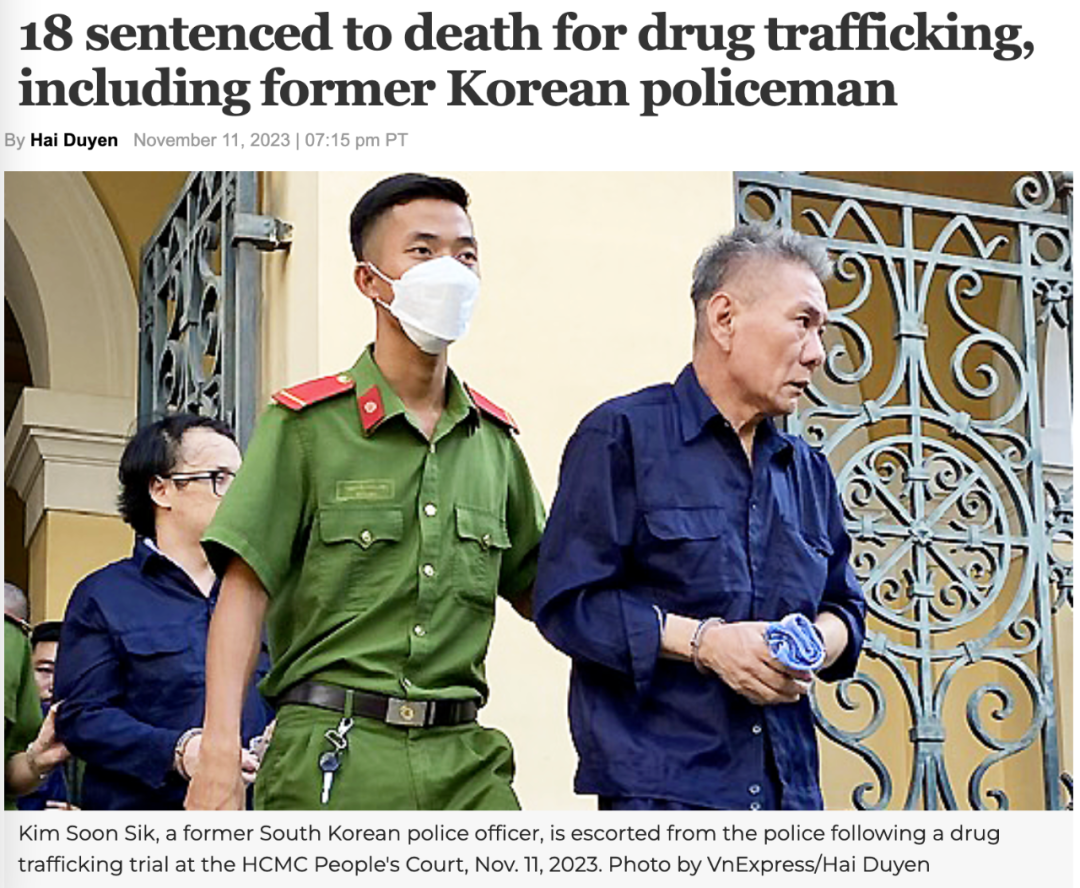 据《越南快报》报道,涉案的2名韩国人分别是63岁的韩国前警察金顺植(音)和30岁的姜善福(音)。此外,58岁的中国男子李天管(音)在经过4天的审判后,也因贩毒罪被判处死刑。