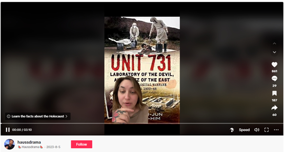 采访视频截图最开始,美国人先找到了自己国家的历史,谴责日本偷袭了美军在夏威夷珍珠港的军事基地。于是,“珍珠港”率先成了社交媒体平台X的话题热词。 可随着资料搜集越发深入,美国网民发现,早在袭击美国海外基地的10年前,日军就霸占了另一个国家的大片国土,所到之处烧杀劫掠,无恶不作。在这个国家的政府所在地,日军制造了一场骇人听闻的大屠杀,还把平民和战俘抓去做各种惨无人道的生化实验。这个国家就是我们中国。 于是美国网民被震惊了,日本和美国作战时犯下的罪行,远不是日军的最下限,于是为了声讨日军这些在美国鲜为人知的战争罪行,许多博主把自己了解的更多历史做成科普视频发去了TikTok。