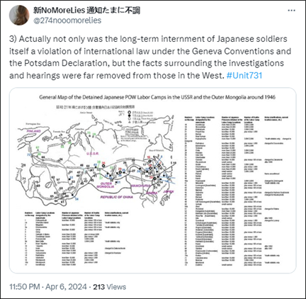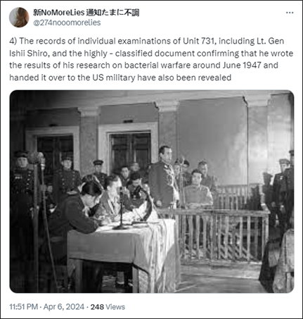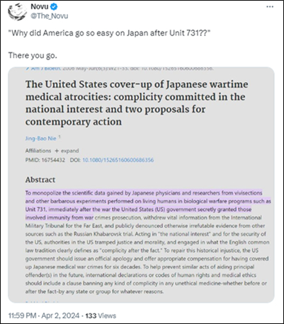 刚接触这段历史时,美国网民的反应非常激烈,本来这些美国网民只是想吐槽下那位专家,但知道中国的抗战史后,他们在各大平台分享自己对这些历史的感想,一时间,“南京”“731部队”被大量讨论,登上了美国社交媒体的热搜榜。 美国网民对这些历史的感慨,有兴趣的读者可以参考我们此前发布的文章:“731部队”“南京”词条在美国突然火了,居然是因为…… 最初,许多试图替侵华日军辩护的日本网民被美国人的证据驳得哑口无言,可随着他们也回去翻查历史资料后,日本网民也迅速找到了一个对自己极为有利的事实:日军“731部队”的成员在战后将研究成果移交给了美军,在美国的庇护下逃脱了战争审判,这些研究资料至今仍存放在美军德特里克堡基地实验室等地。 因此,在X平台“731部队”的词条下,迅速出现了日本网民的“科普帖”,这些人贴出各种记载、数据表明:美军拿走了731部队通过非人道实验获得的资料,并替731部队销毁了罪证。