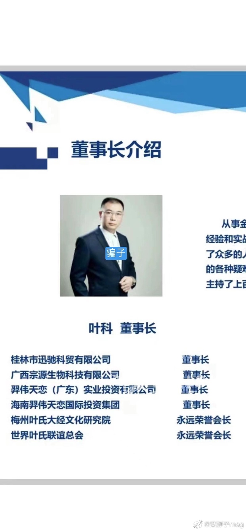 太多蹭圈子害人的骗子游走世间,真正的红三代怒斥骗子借爷爷光环- [98] (2024-10-13 11:51:18) (0) (0)汇总一下最活跃的4个假亲戚:第一二三是同一个人,也说自己叫叶子,说要搞国际学校等等不靠谱的事。估计骗了不少[允悲]第四张是个地道的老混混老江湖叶子在北京和全国各地骗,自己包装了个老台酒,茅台的价格。男的叶科跑到梅州去骗,说要投资140个亿,真敢啊[允悲]深圳的这个假侄子,骗吃骗喝骗酒,最近估计跑路了。图七八直接把自己当成领导了,每次场合的名字都不一样,但都姓叶,还叫叶先平[黑线][黑线][黑线]活跃在珠海深圳,有时候还搭档着丑叶子一起骗,互相吹捧。最后一个简直是惨不忍睹,叶玉龙,假名之一,久不久搞个生日会让人送礼,也是很多假名字。上当受骗的人活该啊!我已经尽力提醒了[奥特曼][奥特曼][奥特曼][奥特曼][奥特曼][奥特曼][奥特曼][奥特曼][奥特曼][奥特曼][奥特曼] 还有几个的相片我都懒得找了。 以上是6个最活跃的骗子江南7骗之6个,还有一个更离谱的高段位,我得整理一下再发。