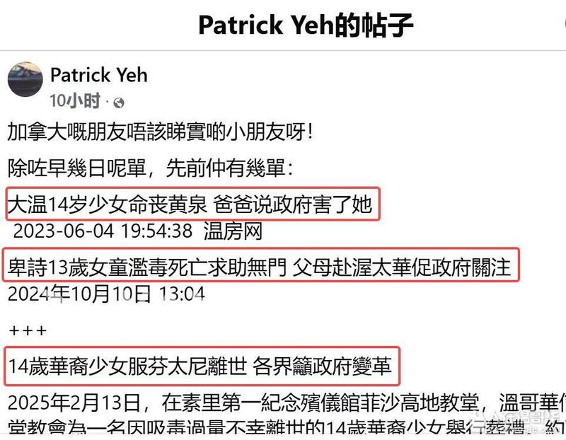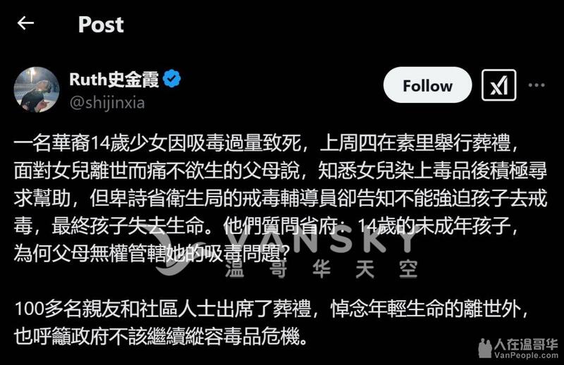 星岛日报报道,2025年2月13日,在素里温哥华信友堂教会为一名因吸毒过量不幸离世的14岁华裔少女举行葬礼。约百名亲朋好友、社区成员及政界人士参加了悼念仪式。在随后举行的记者会上,逝者家属及多位政界人士呼吁政府做出变革,让青少年远离毒品的危害 。 星岛日报报道,2025年2月13日,在素里温哥华信友堂教会为一名因吸毒过量不幸离世的14岁华裔少女举行葬礼。约百名亲朋好友、社区成员及政界人士参加了悼念仪式。在随后举行的记者会上,逝者家属及多位政界人士呼吁政府做出变革,让青少年远离毒品的危害 。
