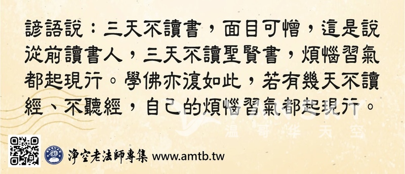 諺語說:「三天不讀書,面目可憎。」這是說從前讀書人,三天不讀聖賢書,煩惱習氣都起現行。學佛亦復如此,若有幾天不讀經、不聽經,自己的煩惱習氣都起現行,隨順煩惱習氣決定墮落。煩惱習氣就是輪迴心,煩惱習氣作主,所有一切思想見解、言語行為,都是造輪迴業,將來的果報當然在六道輪迴。(990413早餐)