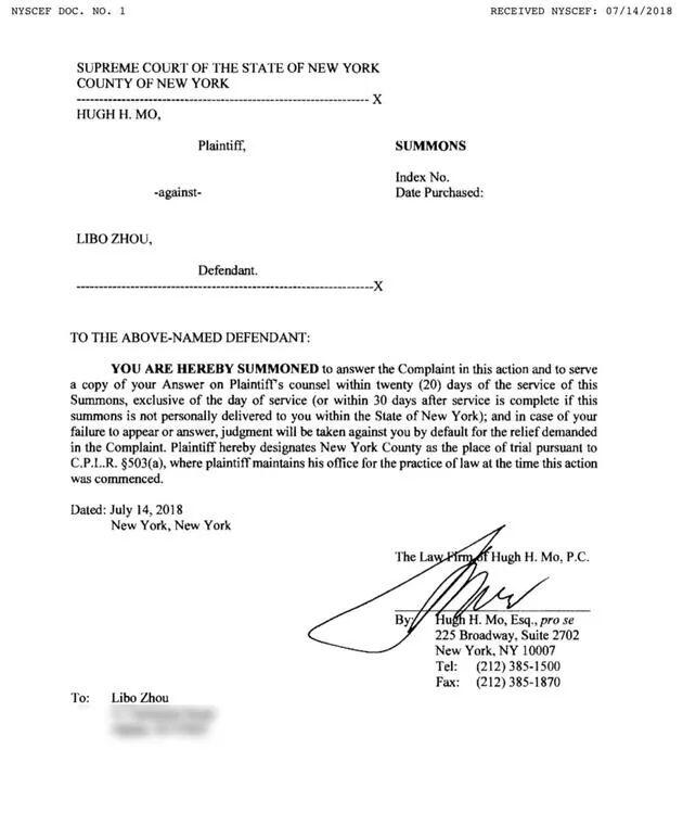 The above picture comes from "WeChat Account 华人生活网" 日前本案在纽约州高院获得进展。经法官裴利(William Perry)裁决,周立波撤案动议被否决。 根据裁决书,莫虎陈列了周立波在社媒上发表的共计17条言论,以此提出诽谤控告,认为其言论已造成了自己“名誉、职业、业务,以及实际和潜在的客户关系”,造成了至少1000万美金的损失。