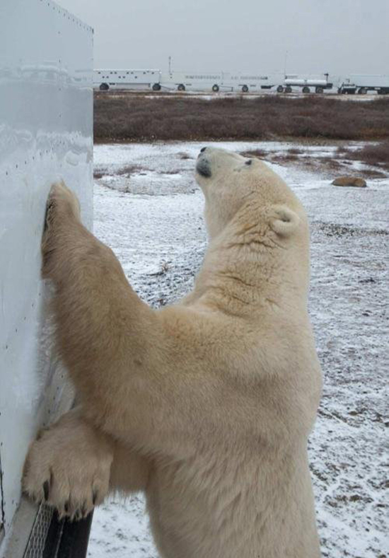北极熊在车外转了几圈,短暂停留后就去享受它的美餐了。