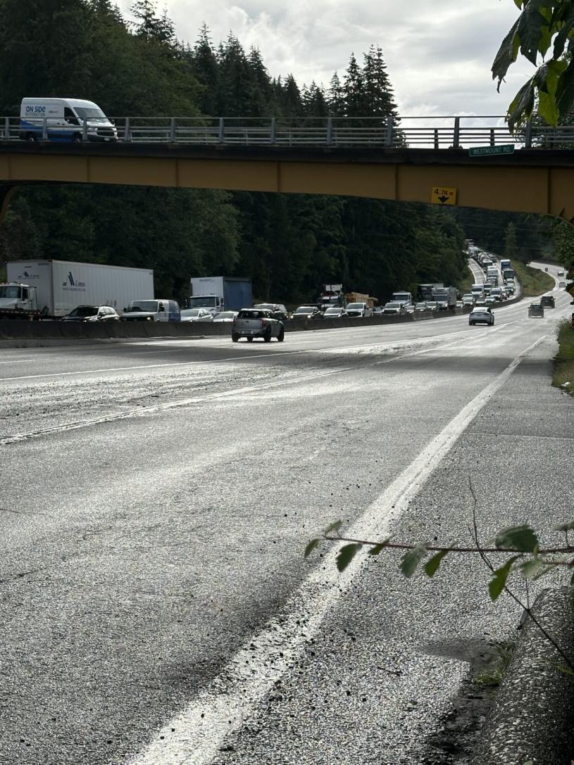 警方暂时关闭了西港路 (Westport Road) 附近考尔菲尔德大道 (Caulfeild Drive) 出口处的 1 号高速公路西行,导致周四早上交通大混乱。