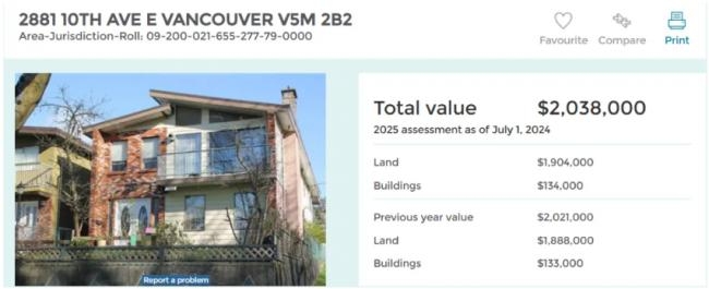 2881 E 10th Avenue政府估价$2,038,000,成交价5,804,000加元,是估价的2.85倍。