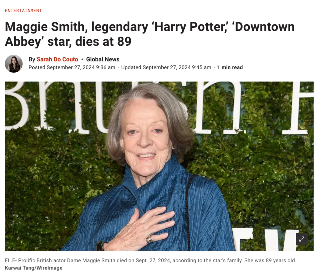 全球影坛传来一则令人痛心的消息:因在《哈利·波特》系列电影和《唐顿庄园》中饰演经典角色而为人熟知的英国传奇影星玛吉·史密斯(Dame Maggie Smith)刚刚去世,享年89岁。