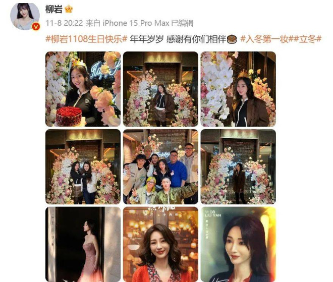 11月8日,柳岩刚刚度过了自己的43岁生日,分享了九宫格庆生图。照片里柳岩被生日派对现场的鲜花包围,头戴金色生日帽,穿着黑白色小香风上衣和棕色皮裙,与朋友开心合影。