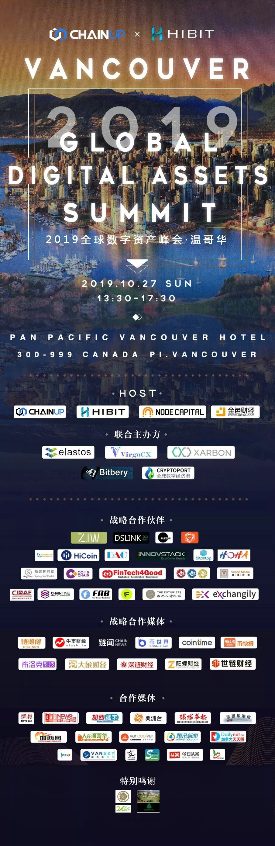 2019年10月27日,在加拿大BC省温哥华市中心的地标建筑五帆酒店,由Hibit Blockchain、ChainUP、节点资本、金色财经共同发起主办的第二届(2019)全球数字资产温哥华峰会(2019 Global Digital Assets Vancouver Summit )盛大召开,本次活动邀请到主流区块链平台创始人、技术领袖、专家学者、各行业精英代表近百位,做专业主题演讲及PANEL,吸引了近千位市民参会,可谓盛况空前。