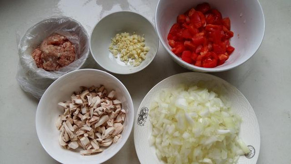 1.番茄洗净,开水烫一下去皮切碎。大蒜,洋葱去皮洗净切碎。蘑菇洗净切碎。