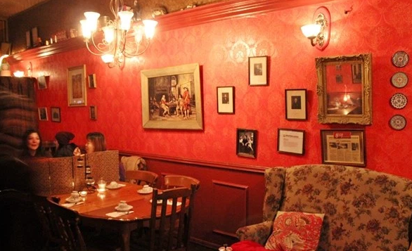 称呼这家起司店是城市的小宝石一点也不为过 – 窄窄的店面,走进大门后仍然感觉局促。原因来自不大的空间涂以艳丽的红色,幽暗的灯光,墙上小挂画以及银饰营造出中东和英式融合的氛围。桌子相互紧挨,人们在站立等候的顾客注视下肩并肩用餐,还必须注意交谈的音量以免打扰桌子另一头以屏风相隔的其他客人。
