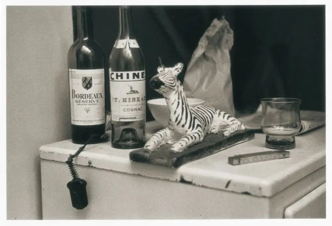 这一系列除了一张,都是罗伯特送给我的,大部分是大概50年代在巴黎拍的。这张照片是在Robert纽约的家,在他破破烂烂的冰箱上面放了这些东西。常玉做的斑马,我们已经不知道它在哪里了。这个瓶子是“Hine”,是个有名的白兰地的牌子,那常玉每次看到罗伯特这个牌子的酒瓶,他就用签字笔在上面加一个C——Chine,法文的“中国”,说我要你随时都有“中国”在你家里。
