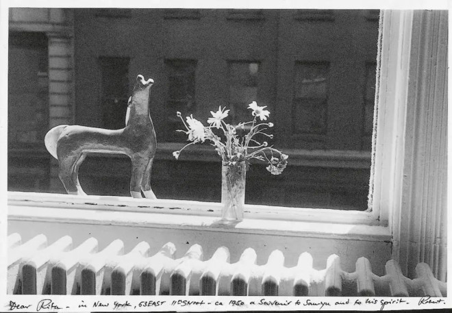 这一张当然是我特别爱的,因为它是罗伯特写给我的,他把常玉的马跟他认为像常玉风格的花放在这里,然后他就写Dear Rita(衣淑凡的英文名),让我们回忆常玉。这张照片我一直挂在家里。