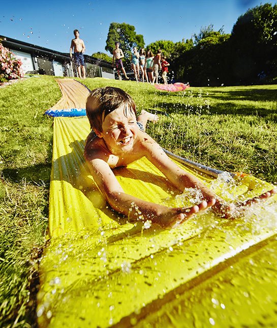 这是一种塑料薄膜,可以铺在草地上,然后只要往上面冲水,薄膜就会变得十分光滑,这时候只要扑倒在上面,就可以滑出很长一段距离,感觉就像游乐场的“激流勇进”!
