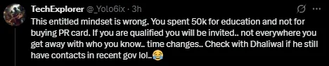 “这种自以为是的心态是错误的。你花了5万用于教育,而不是购买PR卡。如果你符合条件,你就会收到邀请……不是每个地方都能和你认识的人混在一起……”