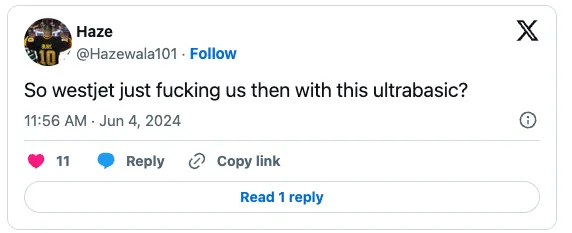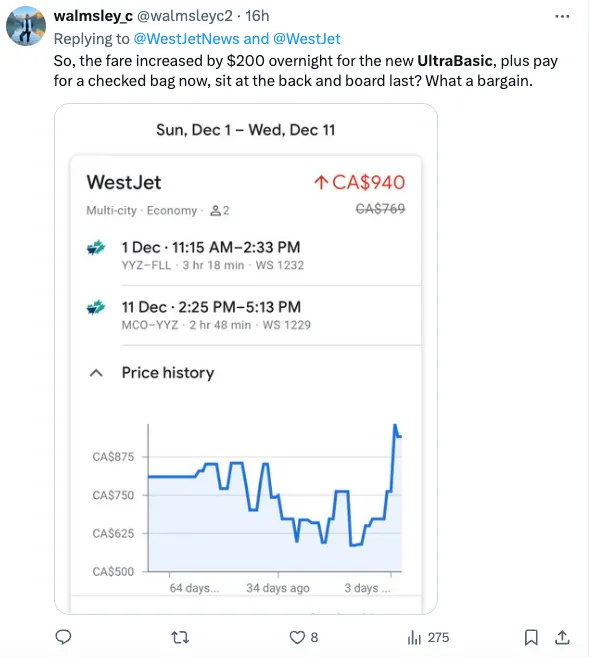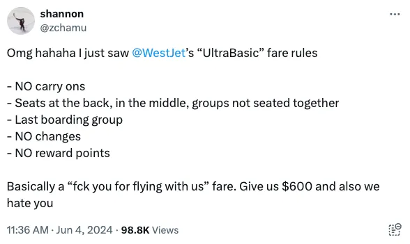 “今天阅读WestJet关于‘超级基础’票价的电子邮件,他们试图将其定位为为消费者提供更多选择,”他说,并补充道:“票价本质上保持不变,但现在,你得不到随身行李并被安排在机尾,这使得超级基础成为国内旅行的相对无效选择。”