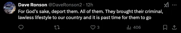 “救命,把他们全都驱逐出去。他们把犯罪、无法无天的生活方式带到我们的国家,早该让他们离开了。”