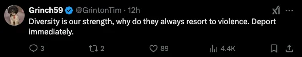 “多元化是我们的力量,为什么他们总是诉诸暴力?立即驱逐。”