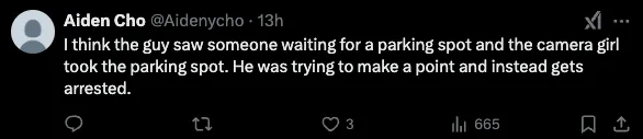 “我觉得那个人看到有人在等停车位,而那个拍摄视频的女生占了那个停车位。他是想表达自己的观点,结果却被逮捕了。”