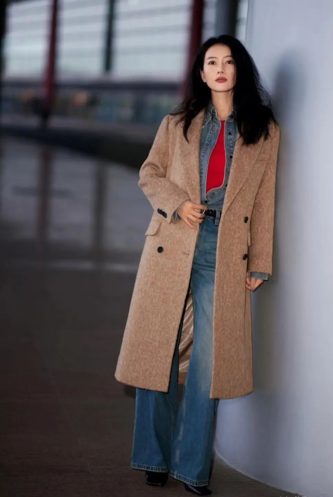 高圆圆驼大衣内搭牛仔衬衫+红T,彰显“复古叠穿”的巧思——牛仔元素中和大衣厚重感,亮红内搭点睛,阔腿裤+短靴强化随性,精准踩中复古混搭趋势,温柔又有力量。