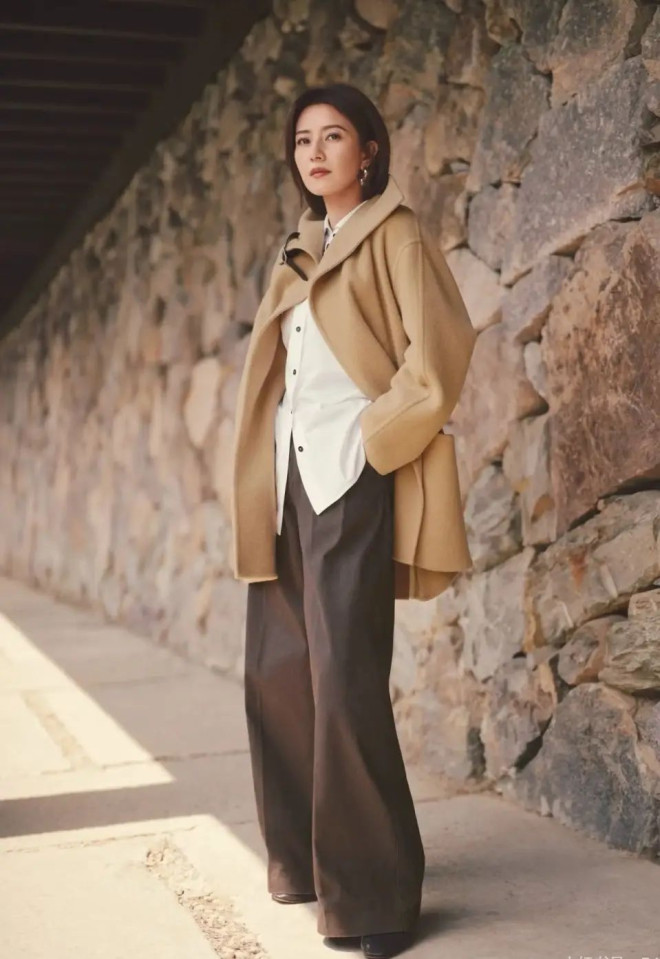 高圆圆另一套的驼色大衣演绎,又是完全不同的风格,廓形驼大衣+白衬衫+深棕阔腿裤,是“知识分子风”的高阶演绎:极简色系碰撞材质对比,利落线条衬出松弛气场,适配秋冬都市通勤的质感穿搭。