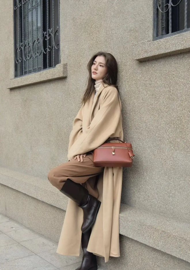 同色系西装叠穿+宽腰带掐出高腰线,驼色大衣的复古金扣是点睛之笔,黑包黑鞋做点缀,把“知识分子贵气感”焊在身上。