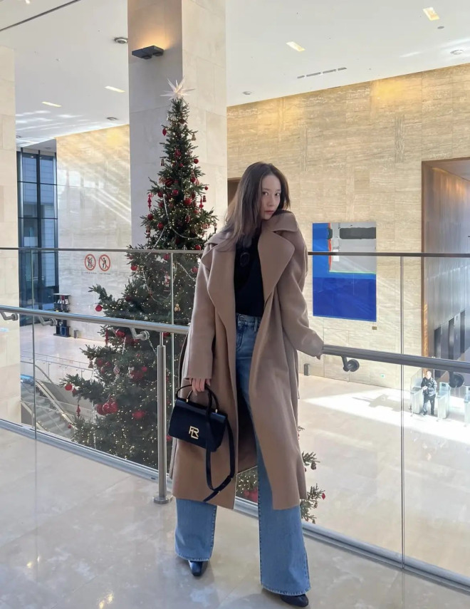 郑秀晶的穿搭很日常又时髦,适合大部分人借鉴,黑色内搭+阔腿牛仔,是“极简通勤”的模板,基础款内搭衬出大衣质感,阔腿裤+方包强化随性,适配都市楼宇间的利落造型。
