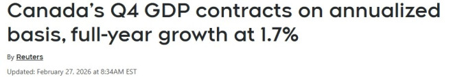 此外,统计局初步估计,加拿大经济在2026年1月可能陷入停滞状态,但该数据仍可能进行修正。