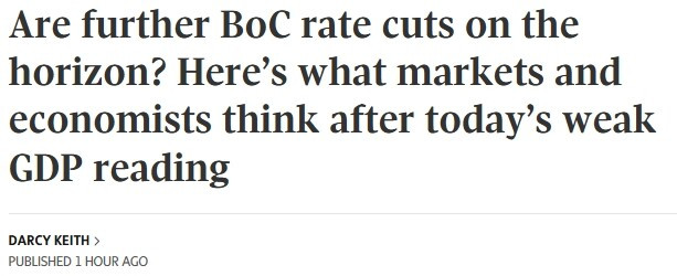 在今天公布的GDP数据低于预期后,金融市场开始押注加拿大央行今年可能再次降息,虽然概率不算很高,但也不容忽视。