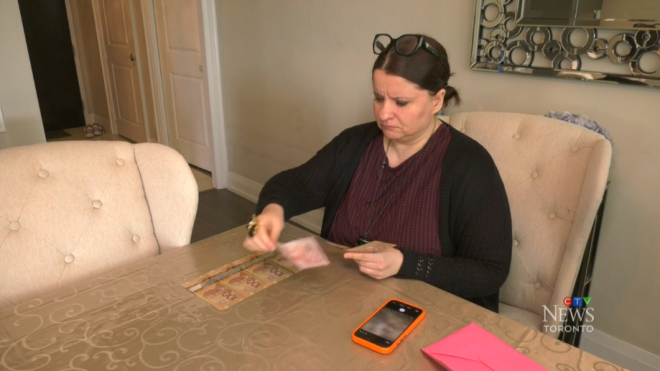 一名多伦多女子在卖掉自己的智能手机后,准备把收到的现金存进银行,却发现这些钱竟然是假钞。