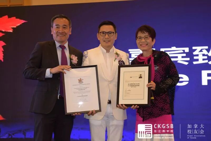 邢怀香校友(中)接受屈洁冰议员(右)和李耀华议员(左)为长江商学院颁发的奖状
