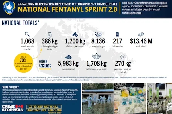 加拿大皇家骑警今早公布缉毒战果,相关数字令人惊讶。 尽管本次“加拿大史上罕见”的缉毒行动彰显出当局对毒品走私和有组织犯罪的打击力度,但其行动结果令人立刻想到美国总统特朗普“所言不虚”——加拿大真是大毒窝呀! 缉毒战果成绩斐然 加拿大皇家骑警(RCMP)今早在一份新闻稿中称:在“全国芬太尼冲刺2.0”行动中,警方共查获了386公斤芬太尼、5983公斤可卡因和1708公斤冰毒。 该行动从2025年5月20日持续到10月31日,在“加拿大打击有组织犯罪综合响应中心”(CIROC)协调下,21个加拿大执法机构、情报机构及政府部门展开合作。 除了毒品,警方还查获现金1346万加元,逮捕起诉8136人,其中包括217名在保释期间仍贩卖芬太尼的嫌犯。 地区分布: 大部分毒品查获发生在安大略省。 芬太尼前体化学品主要来自魁北克省,占查获总量270公斤的83%(224公斤)。 冰毒的主要查获地是不列颠哥伦比亚省,占查获总量1708公斤的51%(871公斤)。 警方表示,多项调查仍在进行中。 细看数字令人震撼 有些事儿不能细琢磨,当你把上述数字罗列起来再看,真能吓一跳: 行动时间仅半年:2025年5月20日至10月31日。 查获毒品超8吨:386公斤芬太尼、5983公斤可卡因、1708公斤冰毒,共计8077公斤。 逮捕起诉8千多:半年时间逮捕8136人,约合每月逮捕1356人,每天逮捕40多人。 保释制度没啥用:217人在保释期间继续贩毒。 毒贩确实不差钱:起获现金1346万加元,注意,这可是“还没来得及分掉及花掉的钱”……这真是个“人为财死、鸟为食亡”的“”诱人“行业。 执法难度非常大:必须由21个机构联手才能完成行动。