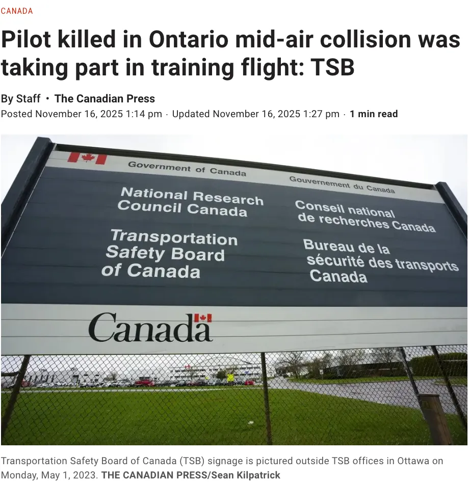 在过去周六(11月15日),加拿大安大略省发生一起空难事故,两架小型飞机在空中相撞,一名飞行员死亡。加拿大运输安全委员会(TSB)表示,飞行员当时正在参加训练。 加拿大运输安全委员会TSB称,空难事件发生在距离渥太华约115公里的 South Glengarry的Martintown小镇。 安大略省警方最先报告了这起事故,他们表示,周六上午11点刚过就接到了报警电话。 据悉,一架塞斯纳(Cessna)172型飞机和一架派珀塞米诺尔(Piper Seminole)飞机在空中发生相撞事故。 安省省警表示,相撞后,其中一架飞机安全着陆,另一架则在树林中被发现。 他们称,这架飞机的飞行员兼唯一乘客当场死亡。 安大略省警方周日告诉CBC,受害者是一名来自蒙特利尔的28岁男子。 安全委员会表示,这两架飞机均属于康沃尔航空(Cornwall Aviation),这是一家位于该地区的飞行学校。 康沃尔航空学校周六在社交媒体上发文称,这起坠机事件“对我们的航空界来说无疑是极其艰难的一天”。 “没有什么能让人为这样的悲剧做好准备,”帖子中写道。 “此时此刻,我们恳请大家为直接受影响的家庭祈祷,并祝愿他们未来的日子里一切安好。” 加拿大运输安全委员会TSB随后派遣一个小组前往现场进行调查。 “寻找塞斯纳飞机的过程很困难,因为它位于几公里外的树林深处,”安省OPP说。“但我们最终还是找到了它。” 另一架飞机上有两人,两人均未受伤。 运输安全委员会(TSB)高级调查员J.P.雷尼尔说,两架飞机在空中相撞时,似乎都在进行各自的训练。 雷尼尔说,据推测,撞击导致塞斯纳172飞机的一侧机翼断裂。 “它们是如何以及为什么相撞的,我们目前还不清楚,”他说。“希望调查能在日后查明真相。” 附近的居民Glen Finbow告诉CBC,事发时他正沿着自家农场的车道走在附近,突然听到一声巨响。他转过身,看到一架飞机只剩一个机翼,正在坠落。 Finbow说他立即拨打了911。 “我估计飞机当时大概在2000英尺(约610米)的高空。你只能看到它直直地往下坠,”他说。“没有转弯,没有旋转,什么都没做。就是直坠而下。”