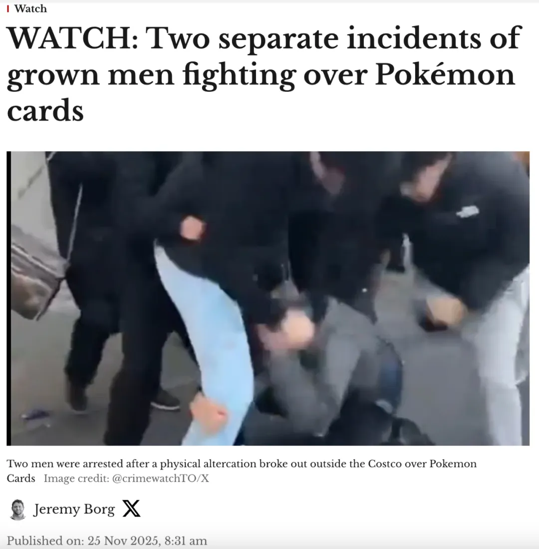 本周,加拿大多地Costco又现排队名场面。   排队原本只是为了抢购一款热门商品,商店却意外变成了更像拳击场而不是大型连锁店,让人叹为观止。   多家Costco爆发了混乱,甚至警方抓捕数人!     Ottawa 警方表示,周一,两名男子在 Barrhaven 的 Strandherd Drive 上的 Costco 店外发生肢体冲突后被逮捕。   争执的原因?   Pokémon 卡牌!   警方在早上 7 点 15 分刚过接到报案,说有多人在排队时发生斗殴。根据警方的说法,参与者试图抢购需求量不断飙升的收藏卡牌,这种商品在北美各地屡次引发类似的混乱,因为收藏者和转售者争相抢到密封卡盒。     警方向 CTV News Ottawa 确认,这起纠纷的“高需求商品”正是 Pokémon 卡牌。两人在冲突中受了轻伤。两名被捕男子随后被控袭击罪。警方没有公布他们的名字。   Ottawa 警方表示预计不会再有进一步逮捕,但这起事件凸显了当今收藏品市场一个不同寻常的现实:有时候“最大的战斗”不是在 Pokémon 游戏里,而是在结账队伍中。   相关冲突场面被搬运到了X上,引发大批网友爆议!   X用户Toronto Crime Watch@CrimewatchTO 表示:“在 Ottawa 的 Costco 发生的那场因 Pokémon 卡牌引发的斗殴事件,最终导致两人被捕。   加拿大人到底有多穷?成年人白天在 Costco 排 2 到 3 个小时的长队,只为了买 Pokémon 卡牌,接着立刻转手卖给别人赚 50 加元利润。”     视频动图:非常之激烈,揪着人衣服,还把人摔地上了:     就这样围殴:     看起来好歹算是平息了:     网友在评论区炸了!   “如果他们等 3 个小时只为了赚 50 加元,那就是每小时 16.67 加元。最低工资是每小时 17.60 加元,哈哈。”     “这就是为什么他们需要移民来工作、推动加拿大经济增长,因为加拿大人正忙着为宝可梦卡牌打架。”     “我很确定这些人不是加拿大人。”   “真加拿大人不会做这些事情——这些是新移民哈。”   “有一个完整的、几乎‘隐形’的卡牌社区,他们不仅收集宝可梦卡,还有运动卡和其他类型的卡牌。其中一些人靠这个谋生,另一些则是严肃的投资者。这是一个真正的“弱肉强食”的世界,充满不断的交易和博弈。高峰时的收益极高,低谷时的损失也很惨烈。”   “没看到(视频里面)有加拿大人”。   “2015年左右开始这个国家就变了……”   “下一步你就会看到地下 Pokémon 打斗俱乐部了。赢家拿 Pokémon 卡牌,哈哈。”   “新常态”。   “这就是来自第三世界的文化多样性。谢谢你们。特鲁多,卡尼,自由党。”   据报道,在阿尔伯塔省 St. Albert 的另一家 Costco 也出现了类似场面。一名目击者描述称,有顾客试图绕过商品限购规定,导致现场紧张升级。   “他们带了多张 Costco 会员卡,试图购买超过每人限购两件的数量。用 3 到 5 张会员卡想多买,但 Costco 经理拒绝了。他们随后试图伸手越过员工去抓商品,于是爆发了打斗。”     这一说法是匿名提交的,阿尔伯塔当局尚未证实。   感受下现场↓就这样猛猛推搡:   结果悲剧了,警方到场:   Citynews也报道,两名男子因周一早晨在埃德蒙顿附近的一家Costco因宝可梦卡引发的“争执”而面临袭击指控。   加拿大皇家骑警(RCMP)表示,警方在上午9:30过后接到报告称发生争执。一群人因商店对宝可梦卡的购买限制感到不满,局势升级,工作人员遭到袭击。     据悉,两名男子分别为20岁和21岁,原籍安大略省,被控袭击罪,并获条件保释,永远不得返回该Costco门店。他们的首次庭审定于2026年1月5日在圣阿尔伯特举行。     Pokémon 交易卡牌曾经只是怀旧的童年玩具,如今却因收藏者、网上转售者和有限供应而成为需求极高的商品。加拿大和美国各地的零售商都因人潮、排队,甚至暴力事件而实施限购措施。