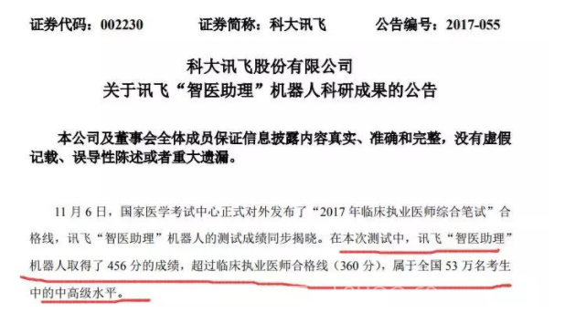 据科大讯飞(002230)11月6日晚间公告,11月6日“2017年临床执业医师综合笔试”合格线公布,讯飞“智医助理”机器人取得了456分的成绩,超过临床执业医师合格线(360分),属于全国53万名考生中的中高级水平。