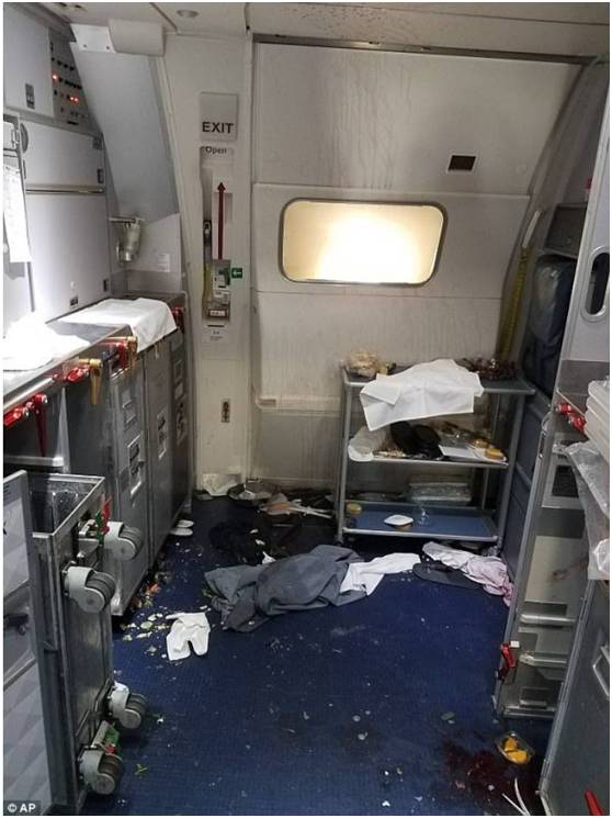 当时我坐在第一排。飞机起飞不到一个小时后,就听到一声巨响。一开始以为是餐车倒了,没有在意,然后就听见有搏斗声,我就冲出去了。