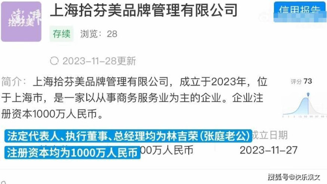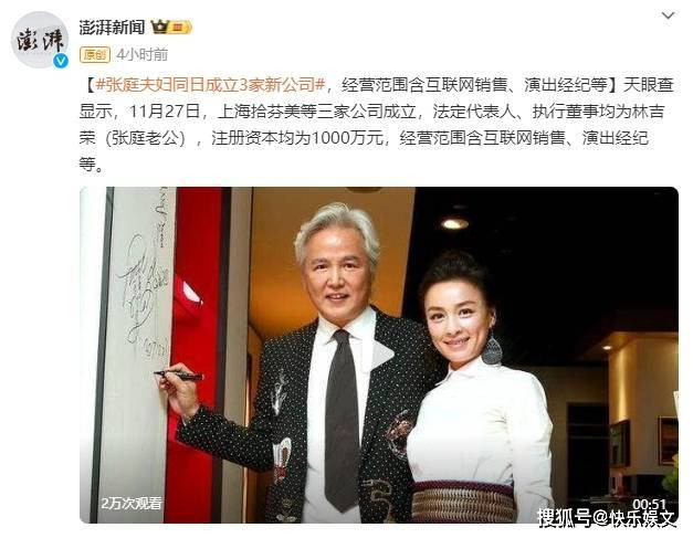 据了解,张庭林瑞阳夫妇在短短一天之内成立了三家公司,涉及文化娱乐等多个领域。