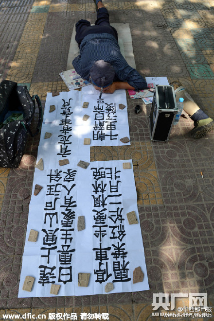 6月29日,在贵阳市中山东路头捆毛笔,爬在地上用头书法的残疾人叫陈明亮,今年61岁。2001年一场意外他成了残疾人,为供养上大学的女儿和读高中的儿子,2005年起,陈明亮刻苦练习头部书法。他书写的作品还被很多市民低价收藏。