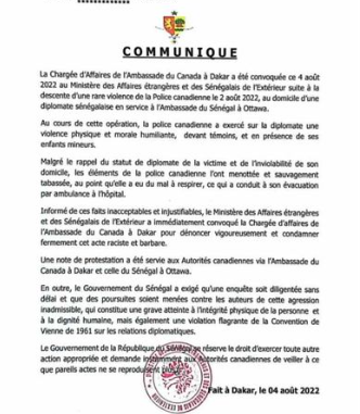 "面对这种情况,塞内加尔政府立即召集加拿大驻[塞内加尔首都]达喀尔大使,强烈谴责并强烈谴责这种种族主义和野蛮行为,"塞内加尔政府在其新闻稿中说。在周日的声明中,加拿大外交部称这一事件是 "不可接受的 "和 "令人遗憾的"。