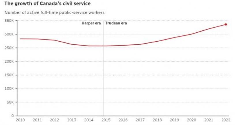 2022 年联邦公务员人数为 335,957 人,与 7 年前相比增长了 30.7%。与此同时,加拿大的人口在同一时期增长了约 8.5%。这代表联邦公共服务的就业增长率是人口增长率的 3 倍。